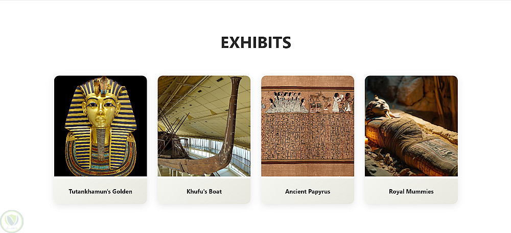قسم المعارض: عرض شبكي للآثار المصرية الشهيرة مثل قناع توت عنخ آمون الذهبي وقارب خوفو
