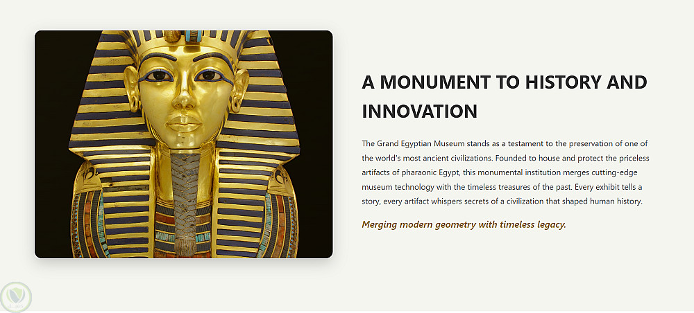 هذا مشروع موقع ويب للمتحف المصري الكبير. إنه موقع صفحة واحدة مبني بـ HTML و CSS يتضمن: