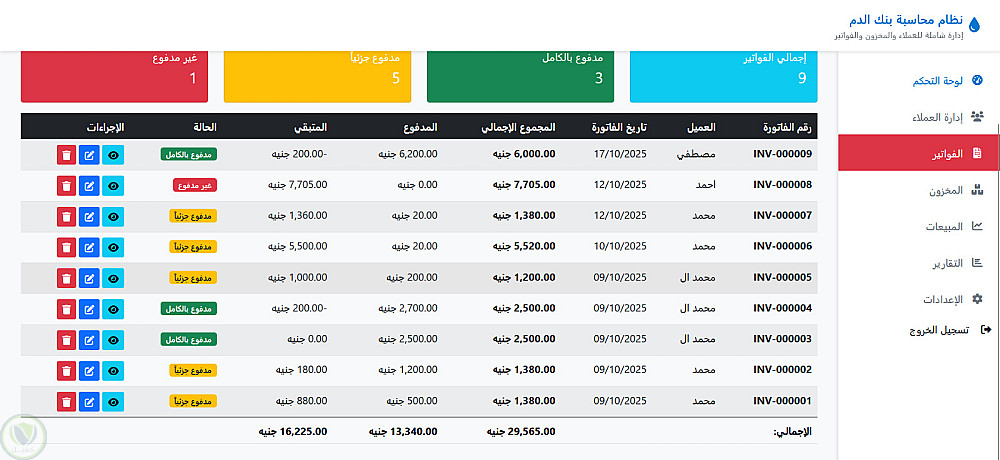 إدارة العملاء: إضافة وتعديل العملاء، متابعة سجل المشتريات، وربط الفواتير بكل عميل.