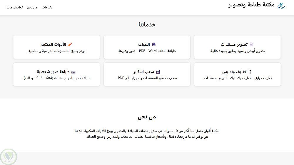 تشمل صفحة رئيسية، معرض الخدمات بطريقة منظمة وجذابة، من نحن، وفورم للتواصل.