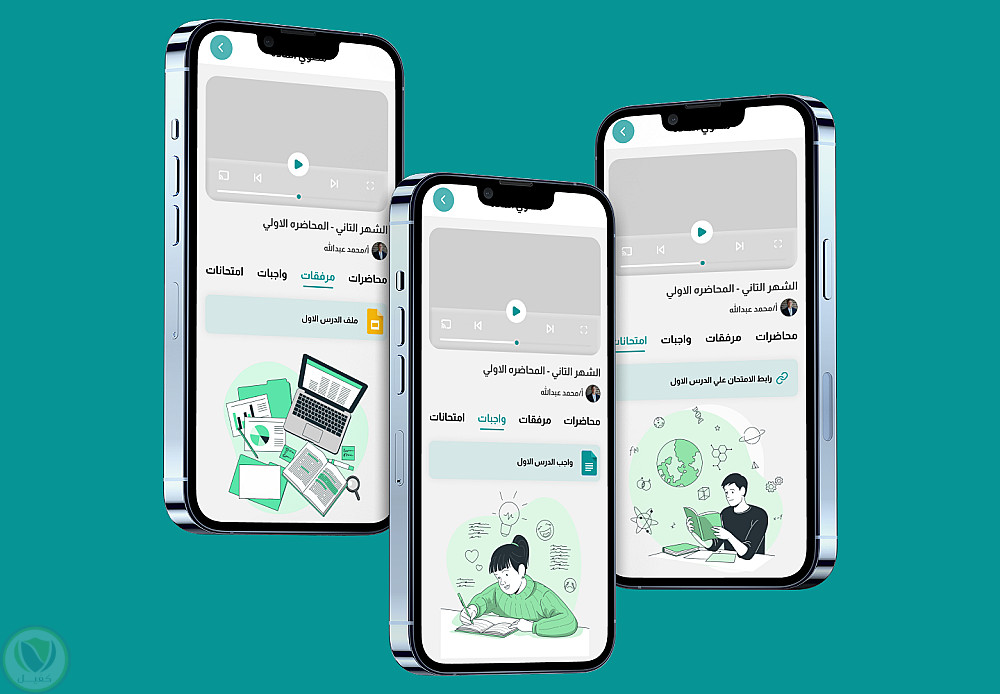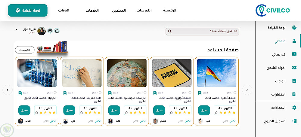 يشمل التصميم مسارات كاملة للدورة: السنة – الفصل – الأشهر – المحاضرات، بالإضافة إلى واجهات الفيديو التعليمية، عرض المستندات، الواجبات والاختبارات، لوحة تحكم المستخدم، وسجل المشتريات.