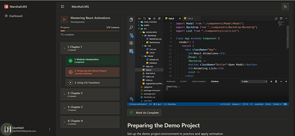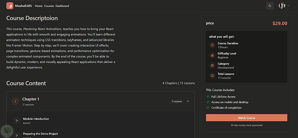 الإدارة والمحتوى: لوحة تحكم متقدمة تدعم تنظيم الدروس بالسحب والإفلات (Drag-and-Drop)، وتخزين سحابي للوسائط عبر AWS S3.