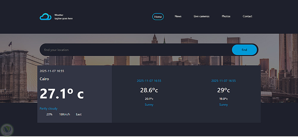 تطبيق ويب تفاعلي لعرض حالة الطقس الحالية والمتوقعة لعدة مدن. المشروع صُمم بواجهة مستخدم داكنة وعصرية