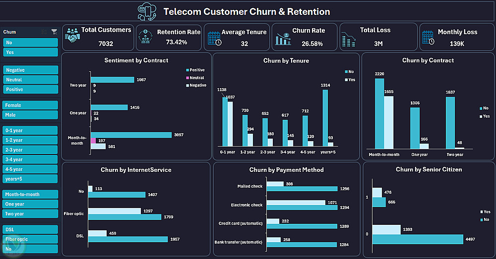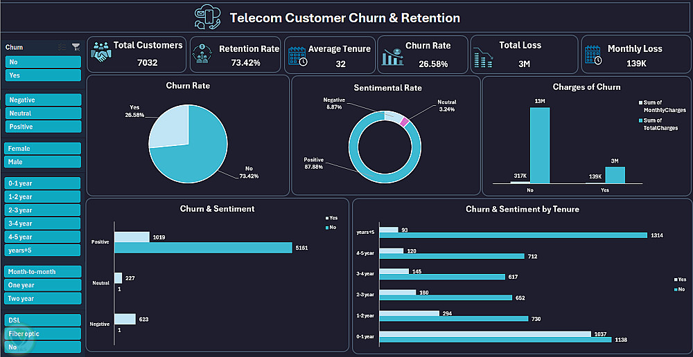 الصفحة الأولى : Churn Overview & Sentiment Analysis: تعرض KPIs مثل Total Customers، Retention Rate، Average Tenure، Churn Rate، Total & Monthly Loss، بالإضافة إلى تحليل شامل للـ Churn، تحليل المشاعر (Positive/Neutral/Negative)، ومقارنة Churn مع Sentiment حسب مدة الاشتراك، مع فلاتر تفاعلية (Slicers) لتسهيل استكشاف البيانات.