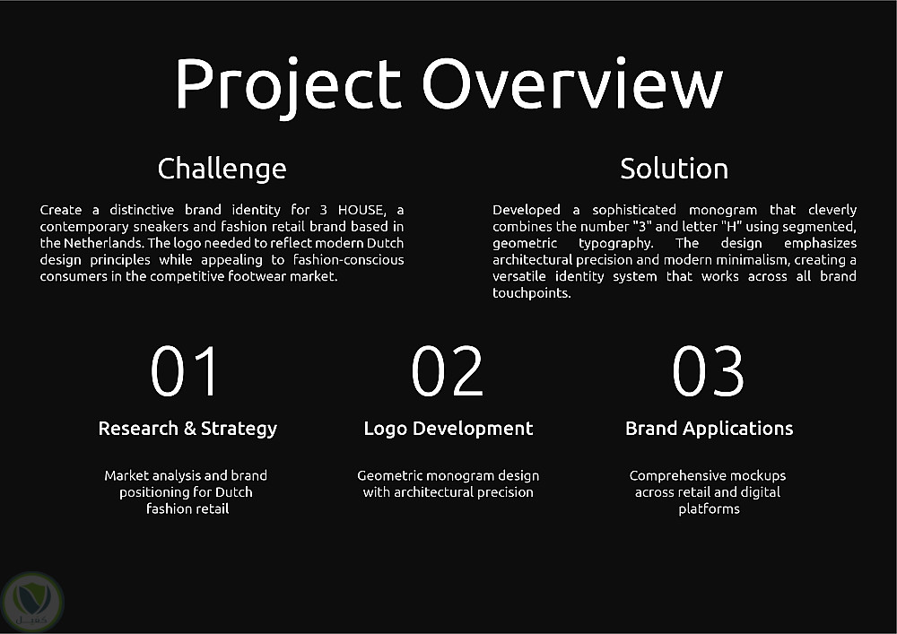 تم إنشاء هوية بصرية نظيفة وحديثة لعلامة "3 هاوس"، المتخصصة في الأحذية الرياضية والموضة العصرية ومقرها هولندا. يشمل المشروع شعارًا مونوغراميًا هندسيًا، ودقة معمارية، والتصميم الهولندي البسيط، ونظام بصري متعدد الاستخدامات صُمم لكل من بيئات البيع بالتجزئة والرقمية.