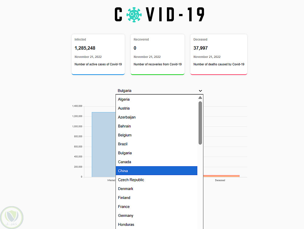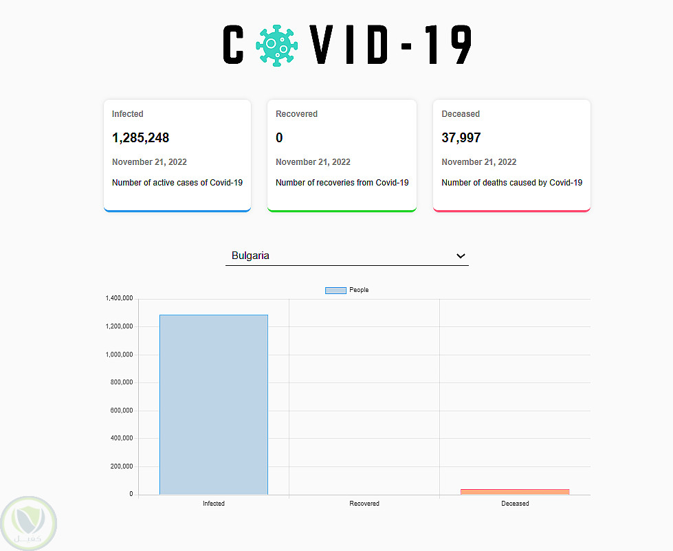 المشروع عبارة عن تطبيق تفاعلي لمتابعة إحصائيات فيروس كورونا (Covid-19) تم تطويره باستخدام React، مع الاعتماد على Chart.js وReact Chartjs 2 لعرض البيانات بصور بيانية ديناميكية، بالإضافة إلى Parcel لتجميع وتشغيل المشروع بسرعة وسهولة.