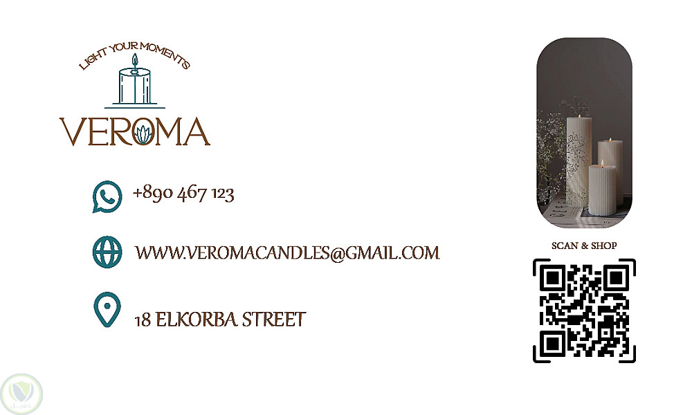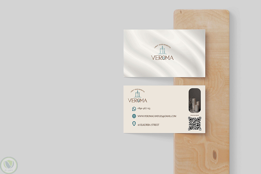 تصميم كارت تفصيلي لبراند veroma للشموع مع تةضيح بيانات خاصه بالمتجر و qr code للطلب اونلاين ومعرفة الاسعار وتم العمل عليه بواسطة illustrator