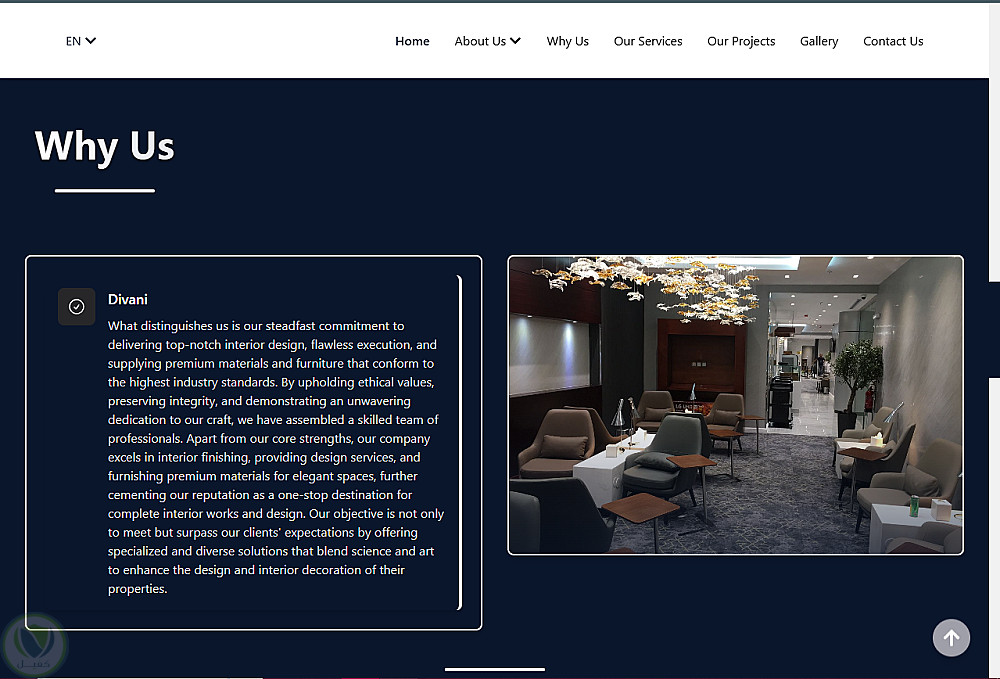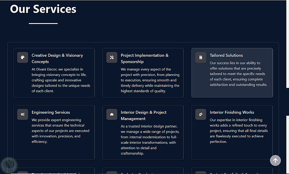 موقع إلكتروني احترافي يعرض خدمات شركة ديفاني المتخصصة في التصميم الداخلي والتشطيبات بأسلوب عصري وواجهة تفاعلية مميزة. تم تنفيذ الموقع باستخدام React وFramer Motion لتقديم تجربة سلسة وجذابة للمستخدم.