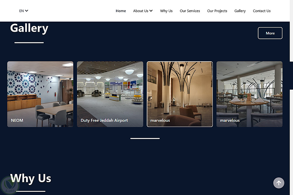 يتضمن الموقع عدة أقسام رئيسية مثل: "لماذا نحن"، "خدماتنا"، "معرض الأعمال"، و"تواصل معنا"، مع التركيز على إبراز هوية الشركة وجودة أعمالها. كما تم الاهتمام بسرعة تحميل الموقع وتجربة التصفح لضمان أداء عالي واستقرار كامل.