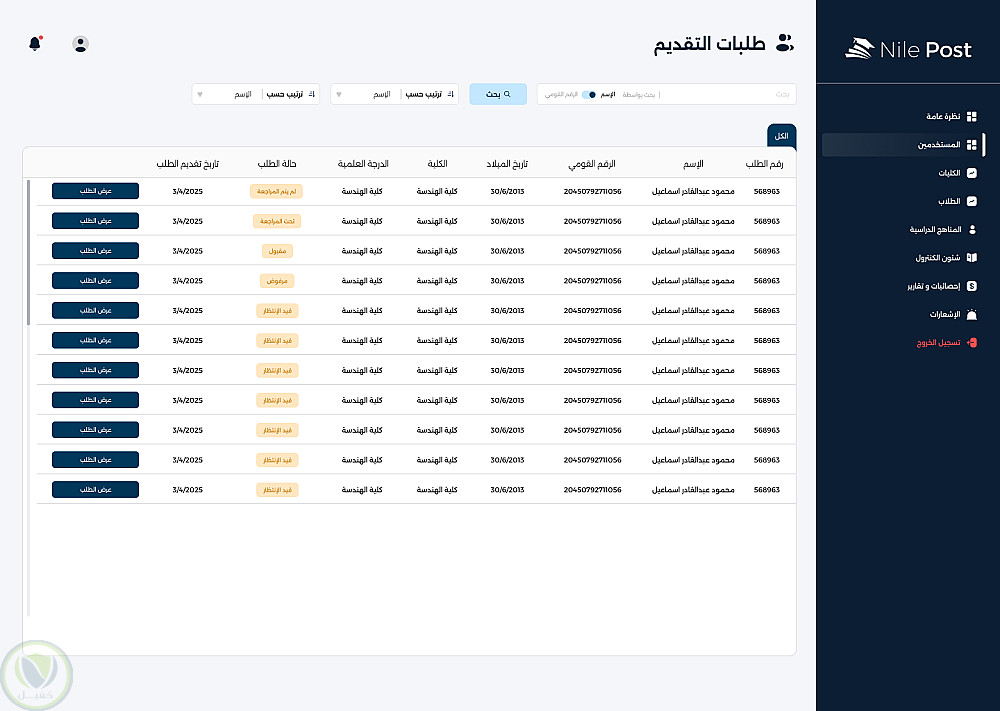 استجابةً لذلك، تم تطوير منصة Nile Post كحل متكامل لإدارة شؤون الدراسات العليا، يعالج تحديات المعاملات الورقية وتشتت البيانات وغياب الأتمتة. يوفر النظام بيئة آمنة وقابلة للتوسع، ويعتمد على تصميم معياري يرفع كفاءة العمل بين الكليات والإدارات المركزية.