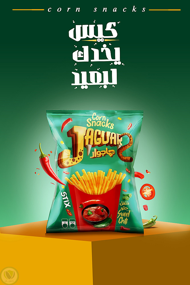 تصميم شبابي حيوي لمنتج جاكوار سناك بنكهة الشطة الحلوة. الألوان الجريئة والخلفية الحماسية تعكس طابع المنتج الحار والممتع. الإعلان يستهدف جمهور الشباب ويعزز الهوية البصرية للعلامة التجارية.