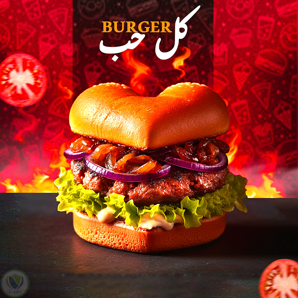 تصميم إعلاني جريء لبرجر مميز بقطعة خبز على شكل قلب، وسط خلفية نارية مليئة برموز الطعام. التركيبة الغنية من اللحم والخضروات تعكس جودة المنتج، بينما عبارة "كل حب" تضيف بُعدًا عاطفيًا للتجربة. الإعلان مثالي لحملات المطاعم التي تستهدف جمهورًا شغوفًا بالطعام والمشاعر.