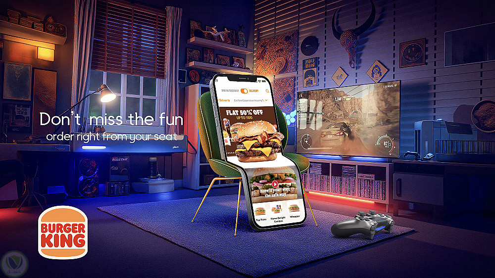 تصميم إعلاني مبتكر يجمع بين عالم الألعاب الإلكترونية ومتعة الطعام السريع. يظهر كرسي الألعاب وكأنه هاتف ذكي يعرض تطبيق برجر كينج، مع عرض مغري "خصم 50%" على البرجر. الخلفية مليئة بعناصر الألعاب مثل الشاشة الكبيرة واليد الإلكترونية، مما يعزز فكرة الطلب من مكانك دون تفويت المتعة. الإعلان مثالي لحملات التسويق الموجهة للشباب ومحبي الألعاب.