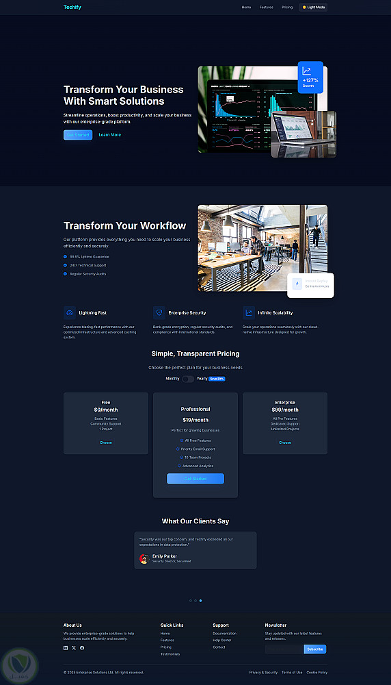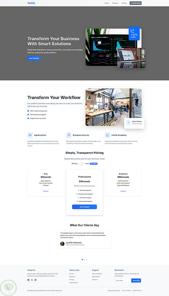 صفحة هبوط احترافية تم تطويرها لعرض منتج SaaS تقني باسم Techify. تعتمد الصفحة على تصميم عصري مستوحى من واجهات المنتجات التقنية الحديثة، وتركّز على إبراز القيمة التسويقية للمنتج من خلال الأقسام الأساسية: المميزات، التسعير، آراء العملاء، ونموذج الاشتراك.