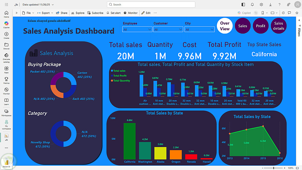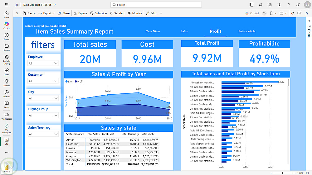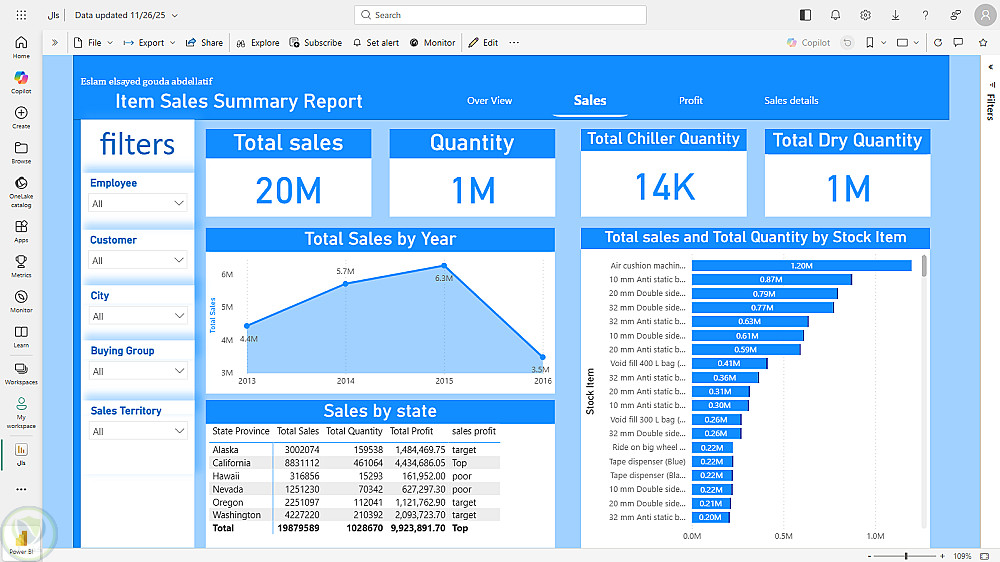 بدات بجمع البيانات في ملف اكسيل شيت وثم النظره الاوله للبيانات و تنظيف البيانات ومراجعت داتا تايب لكل عمود ومراجعت القيم المفقوده واستخراجها باسلامات sql واستبدال القيم الخاطئه او الnull بقيم صحيحه من sql او حذفها اذكانت غير مهمه وثم عمل استنتاج لاعمده محسوبه جديده مهمه للتحليل والنتائج واستخدام المعادلات والdax الصحيحه ثم تحويل الاعمده الي جداول مهم مثل (المبياعات - العملاء - التكاليف والارباح والمبيعات تكاليف الشحن ووقت الشحن المناطق الاكثر طلب والمنتج الاكثر مبيعا والصنف الاكثر طلبا) ثم عمل ربط للجداول في باور كويري باستخدام ريليشن تيبولز وثم اهم جزء عرض البيانات علي power bi واختيار التنسيق والالوان المطلوبه والمريحه وسهلة الاستخدام وتحديد Kpis , اذا كنت تريد مثل هذه التحليل اترك لي رساله او اشتري الخدمه وتواصل معي لنبداء في تلك الرحله لفهم البيانات وتحويلها الي قرارات مهمه تفيد مشروعك.