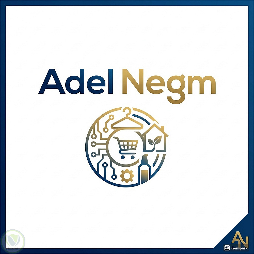 تصميم شعار وهوية بصرية احترافية باسم Adel Negm يجمع بين اللون الأزرق الداكن والذهبي ليعكس معاني الثقة، الاحترافية، والابتكار. يتوسط التصميم أيقونة دائرية متعددة الرموز ترمز إلى التجارة الإلكترونية، التسوق عبر الإنترنت، التكنولوجيا، الذكاء الرقمي، الاستدامة، وإدارة الأعمال، حيث تضم الأيقونة عناصر مثل عربة التسوق، الدوائر الإلكترونية، الترس، المنزل، الورقة الخضراء وزجاجة المنتجات، في إشارة إلى تنوع الخدمات والقطاعات. يتميز الشعار بخلفية بيضاء وإطار أنيق يعزز الطابع العصري والفخم، ما يجعله مناسبًا للاستخدام في العلامات التجارية، المتاجر الإلكترونية، المشاريع الرقمية، منصات التجارة الذكية، والاستشارات التجارية.