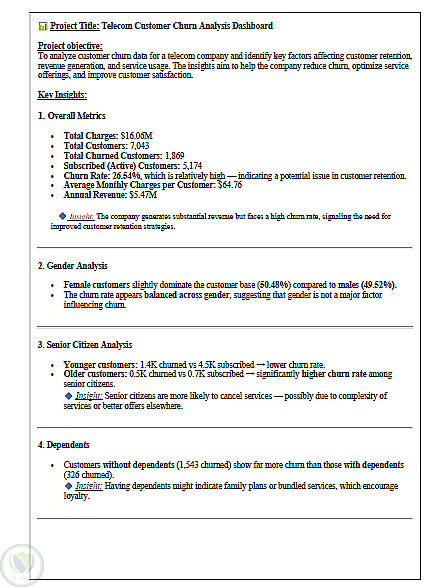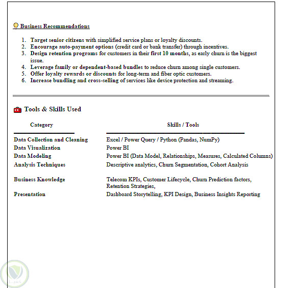 تركز التحليلات على اكتشاف أسباب مغادرة العملاء، وفهم سلوكهم الشرائي، وتقييم تأثير جودة الخدمات والعروض المقدمة على معدلات الاستمرار. وتساعد النتائج المستخلصة الشركة على تقليل معدل تسرب العملاء، وتحسين باقات وخدمات الاتصالات، ورفع مستوى رضا العملاء، مما يدعم اتخاذ قرارات استراتيجية مبنية على البيانات ويعزز النمو المستدام.