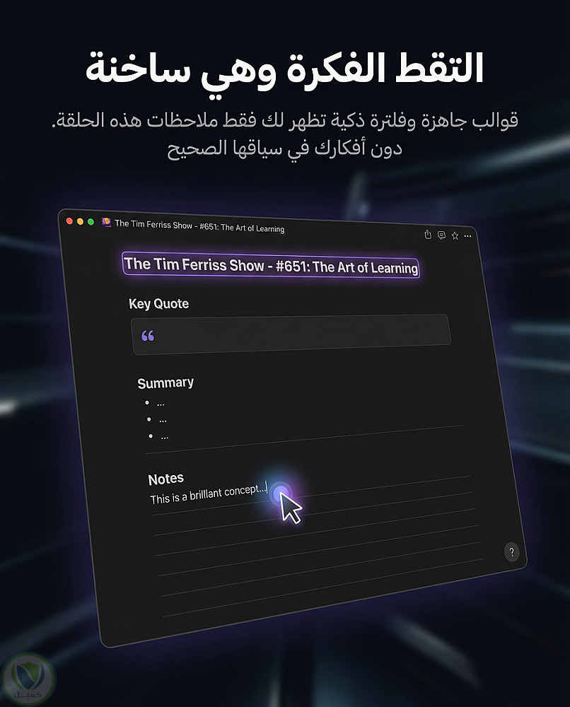 مشروع يجسد قمة الاحترافية في هندسة الأنظمة الرقمية (Digital Systems Architecture). قمت بتطوير هذا المنتج ليتحول من مجرد أداة تدوين إلى "نظام تشغيل معرفي" متكامل يعالج فوضى المعلومات ويحول الاستماع إلى أصول فكرية.