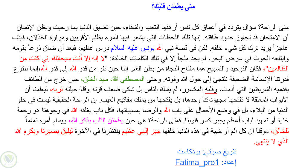 في هذا النموذج، قمتُ بتفريغ مقطع صوتي لبودكاست يتناول موضوعاً وجدانياً (حسن الظن بالله). لم يقتصر عملي على التفريغ بل شمل تحويل النص من اللهجة العامية الدارجة إلى لغة فصحى رصينة تليق بالمحتوى الديني والأدبي.