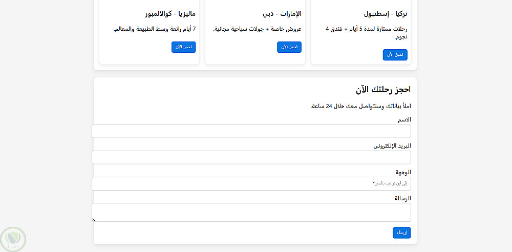 نموذج حجز رحلات: فورم تفاعلي يجمع الاسم، البريد، الوجهة، والرسالة.
