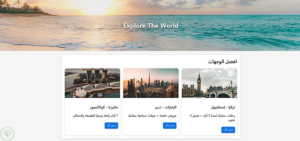 صفحة ويب كاملة مصممة بالـ HTML + CSS + JavaScript لعرض وجهات سياحية وحجز رحلات بسهولة.