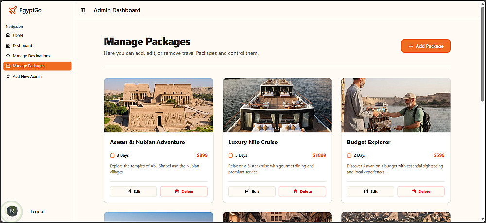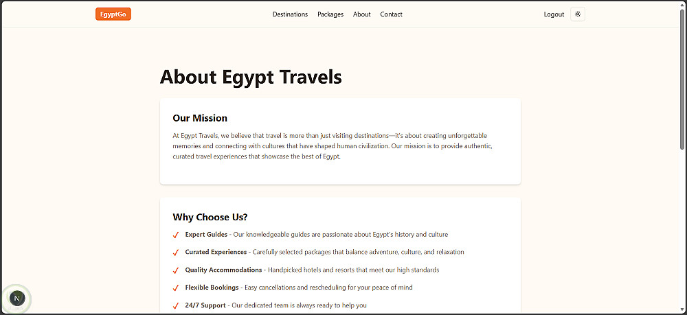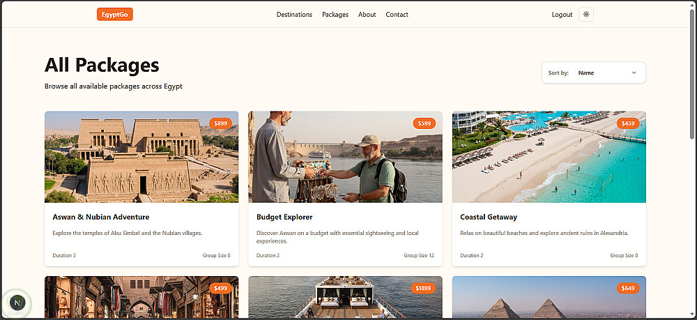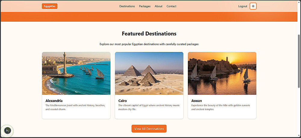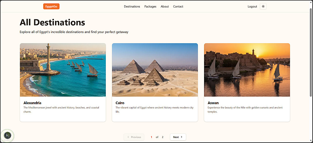 مشروع EgyptGo هو منصة إلكترونية تفاعلية تهدف إلى تسهيل تجربة السياحة الداخلية والخارجية في مصر. يوفر الموقع دليلاً شاملاً للمعالم الأثرية، الأماكن الترفيهية، والمطاعم، مع تزويد المستخدم بكل المعلومات اللازمة للتخطيط لرحلته.