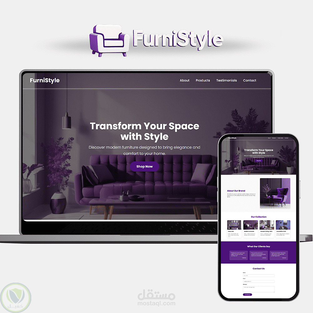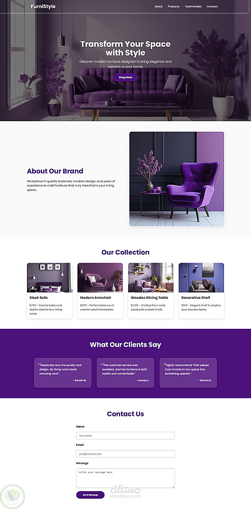 تم تصميم صفحة هبوط كاملة لموقع "FurniStyle" المتخصص في بيع الأثاث المنزلي العصري. التصميم يتميز بجاذبيته البصرية وتناسق الألوان الأنيقة (درجات البنفسجي) التي تعكس هوية العلامة التجارية الراقية. تضمنت الصفحة: