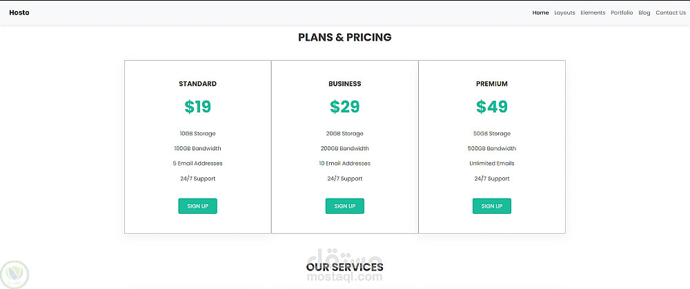 أقسام تفاعلية: تشمل Slider احترافي، جدول مقارنة الأسعار (Pricing Tables)، وقسم الخدمات بتأثيرات Hover جذابة.