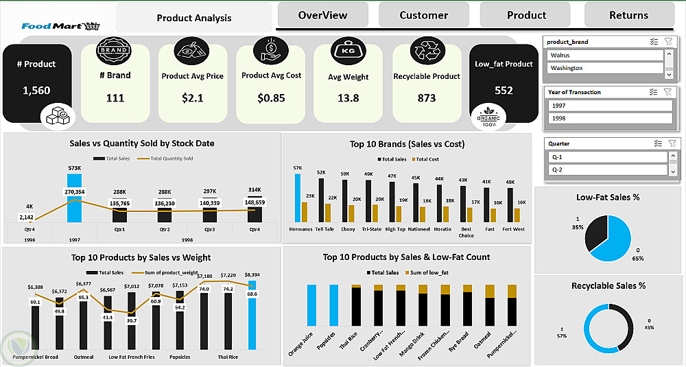 تم عمل لوحة تحكم Excel لشركة FoodMart باستخدام جداول متعددة تشمل العملاء، المنتجات، المناطق، المتاجر، المرتجعات، وبيانات المبيعات لعامين.