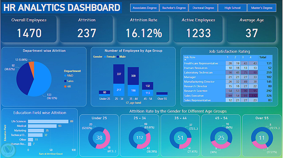 لوحة تحليلات الموارد البشرية مُصمَّمة لتحليل وعرض المقاييس الرئيسية للقوى العاملة. توفّر اللوحة رؤى حول معدل ترك الموظفين للعمل، ومستوى الرضا الوظيفي، والخصائص الديموغرافية، بالإضافة إلى الاتجاهات والتغيرات داخل كل قسم على حدة.