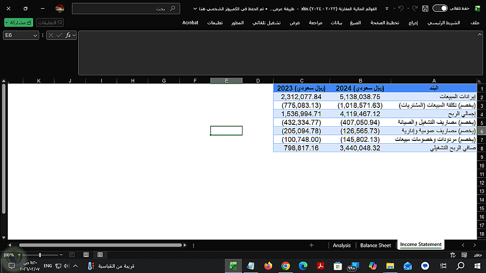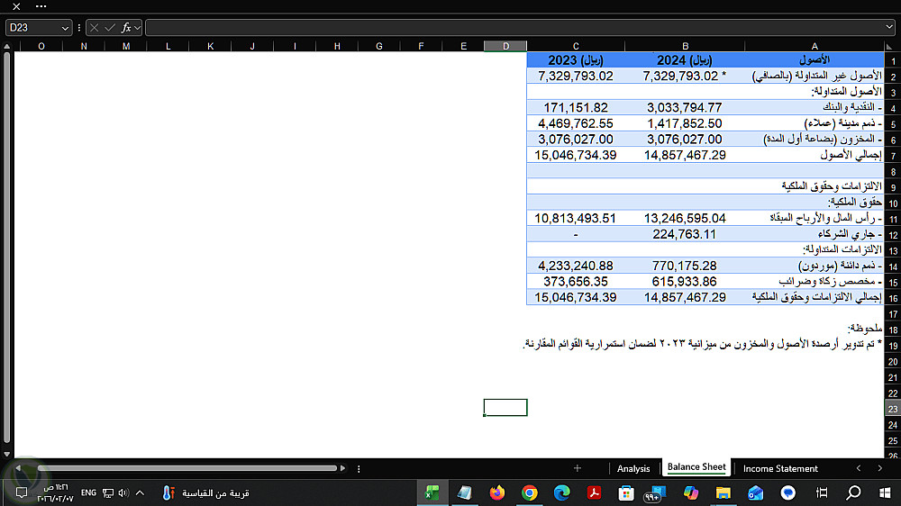 قمت في هذا المشروع بإجراء تحليل مالي شامل لأحد العملاء بهدف تقييم أداء العمل التجاري على مدار عامين ماليين متتاليين (2023 و 2024). الهدف الأساسي كان تحويل الأرقام والبيانات المحاسبية الصماء إلى رؤى واضحة تساعد الإدارة في اتخاذ قرارات مبنية على أرقام دقيقة.