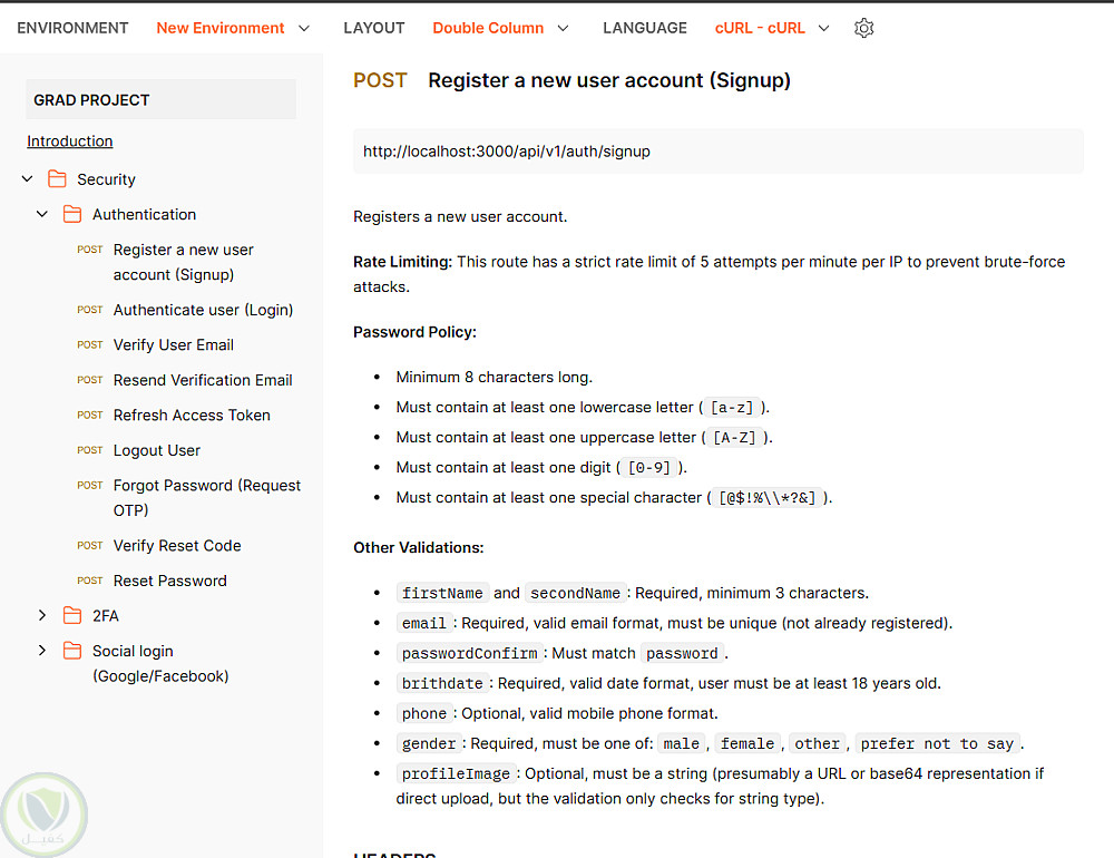 يوفّر حماية متقدمة ضد XSS وNoSQL Injection وBrute-force attacks، مع Account Lockout وRate Limiting وHelmet Security Headers