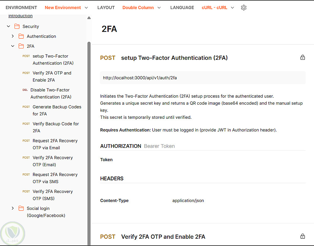 يشمل Two-Factor Authentication (2FA) باستخدام TOTP، إعداد عبر QR Code، Backup Codes، واسترجاع عبر البريد الإلكتروني أو SMS مع Rate Limiting.