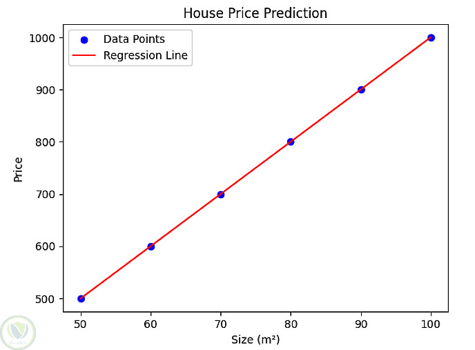 نموذج بسيط للتعلم الآلي يتنبأ بأسعار المنازل بناءً على مساحتها بالمتر المربع. يوضح المشروع أساسيات التعلم الخاضع للإشراف، وعلاقات السمات بالأهداف، والانحدار الخطي. ويتضمن عرضًا مرئيًا لخط الانحدار على نقاط بيانات نموذجية.