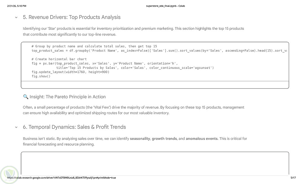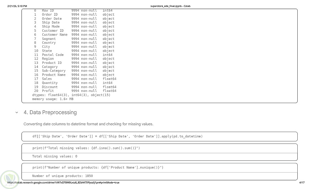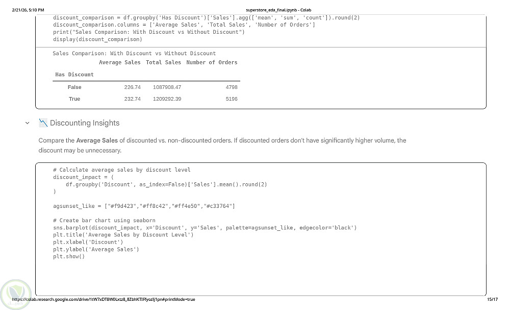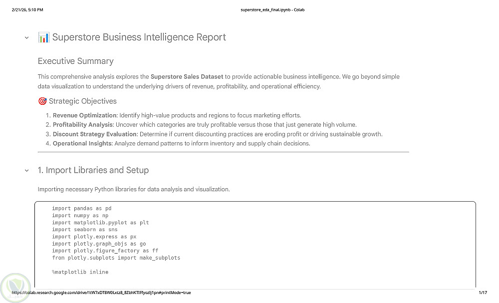 نفذت مشروع تحليل استكشافي لبيانات مبيعات Superstore بهدف استخراج مؤشرات عملية تدعم القرار البيعي والتسويقي. تم تحليل أكثر من 9000 عملية بيع شملت المبيعات والربح والخصومات والفئات والمناطق والتواريخ. بدأت بفحص جودة البيانات وتحويل التواريخ ومعالجة القيم المفقودة ثم حللت اتجاهات المبيعات والأرباح عبر الزمن وأداء الفئات والمناطق وتأثير الخصومات على الربحية وهوامش الربح. أظهرت النتائج أن Technology الأعلى هامشًا بينما Furniture مبيعاته مرتفعة بهامش أقل وأن بعض الخصومات خفّضت الربحية وأن عددًا محدودًا من المنتجات يحقق نسبة كبيرة من الإيرادات. التحليل دعم قرارات التسعير والمخزون وتركيز الجهود على المنتجات والمناطق الأعلى أداءً.