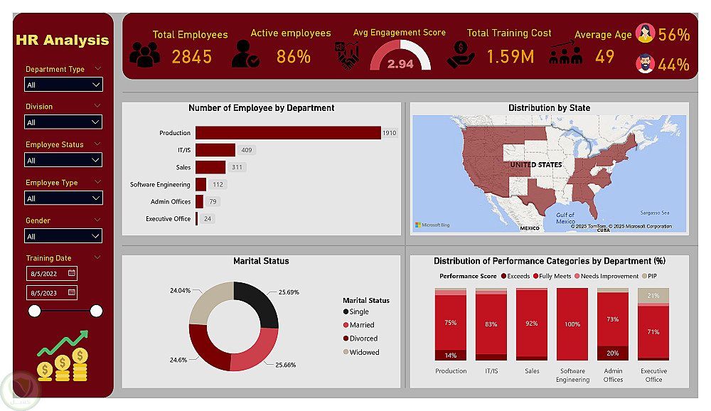 تم تطوير لوحة تحليل بيانات تفاعلية للموارد البشرية باستخدام Power BI لشركة تضم 2845 موظفًا، بهدف تحويل البيانات التشغيلية إلى رؤى استراتيجية تدعم القرار التنفيذي. أبرز المؤشرات: 86% موظفون نشطون، متوسط مشاركة 2.94 من 6، متوسط عمر 49 سنة، وتكلفة تدريب إجمالية 1.59 مليون دولار بمتوسط 560 دولار للفرد.