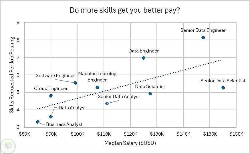 ارتباط المهارات بالدخل: هناك علاقة طردية قوية؛ تعدد المهارات التقنية يرفع الراتب الوسيط بشكل ملحوظ، خاصة في أدوار Senior Data Engineer.