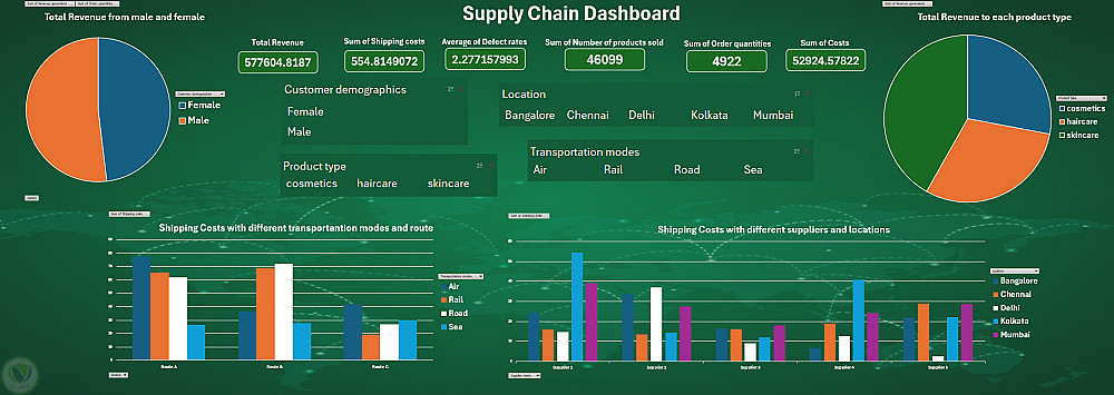أنشأت لوحة تحكم تفاعلية في Excel لتحليل بيانات سلسلة التوريد لمستحضرات التجميل، وتحديد المحركات الرئيسية للإيرادات وأوجه الكفاءة في العمليات اللوجستية.