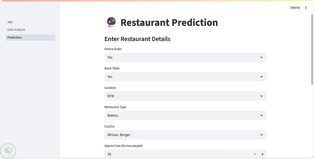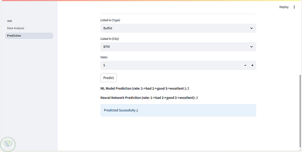 نظام التنبؤ الذكي: يتوقع "تقييم المطعم" (Rate) بدقة فور إدخال بياناته (مثل: الموقع، نوع المأكولات، توفر الحجز).