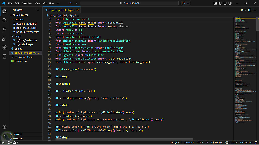 نظام متكامل يعتمد على تعلم الآلة (ML) والتعلم العميق (DL) لمساعدة المستثمرين في فهم اتجاهات السوق وتوقع تقييمات المطاعم المستقبلية بناءً على بيانات (Zomato).