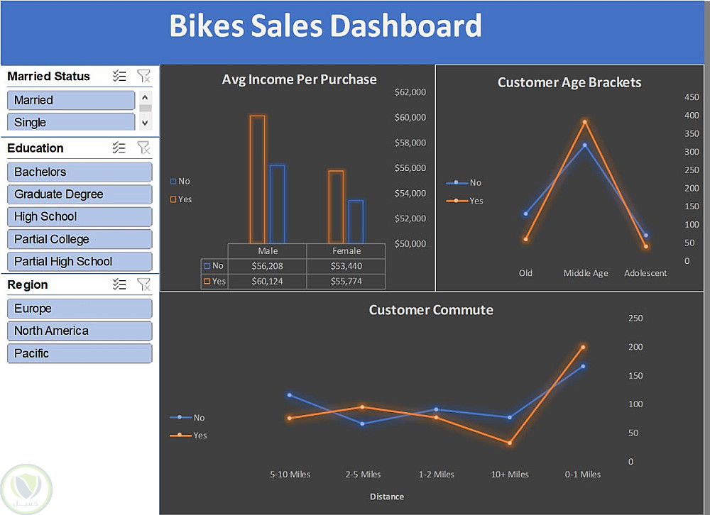 تصميم لوحة تحكم (Dashboard) احترافية لتحليل مبيعات الدراجات، تهدف إلى تقديم رؤى شاملة حول سلوك العملاء. يتضمن العمل: