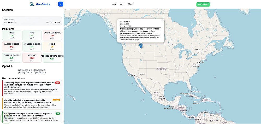 GeoBasira هو موقع ويب ذكي وتفاعلي تم تطويره باستخدام React.js في الواجهة الأمامية وFastAPI في الواجهة الخلفية، كجزء من مشاركتنا في تحدي NASA Space Apps Challenge.