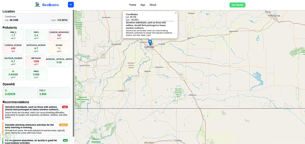تقوم المنصة بجمع وتحليل بيانات الطقس وجودة الهواء من OpenAQ وOpen-Meteo، ثم تستخدم هذه البيانات لتقديم توصيات ذكية حول مدى أمان الخروج في موقع معيّن استنادًا إلى الظروف الجوية ونسب التلوث في المنطقة.