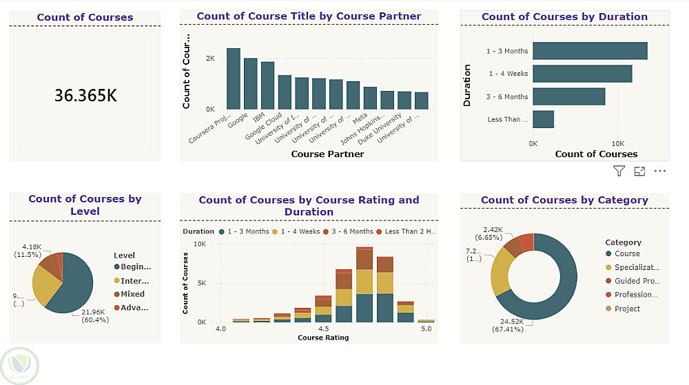 تحليل الاتجاهات: عرض إحصائيات دقيقة لنسبة الدورات حسب المستوى (مبتدئ، متوسط، متقدم) وتصنيفها (Course, Specialization, Project).