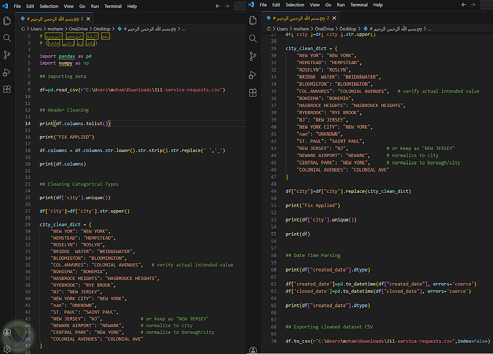 سكريبت احترافي مكتوب بلغة Python يقوم بعملية تنظيف ومعالجة البيانات بشكل أوتوماتيكي، مما يوفر عليك الوقت والجهد ويضمن لك بيانات جاهزة للتحليل أو بناء التقارير.