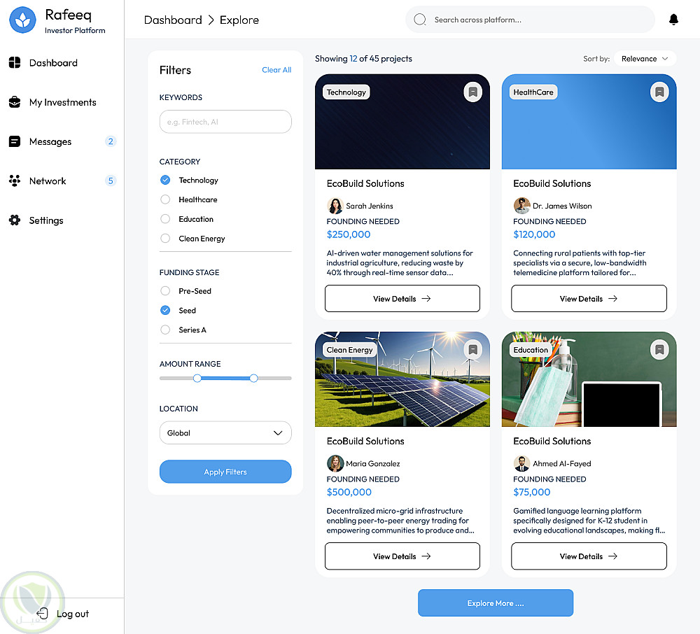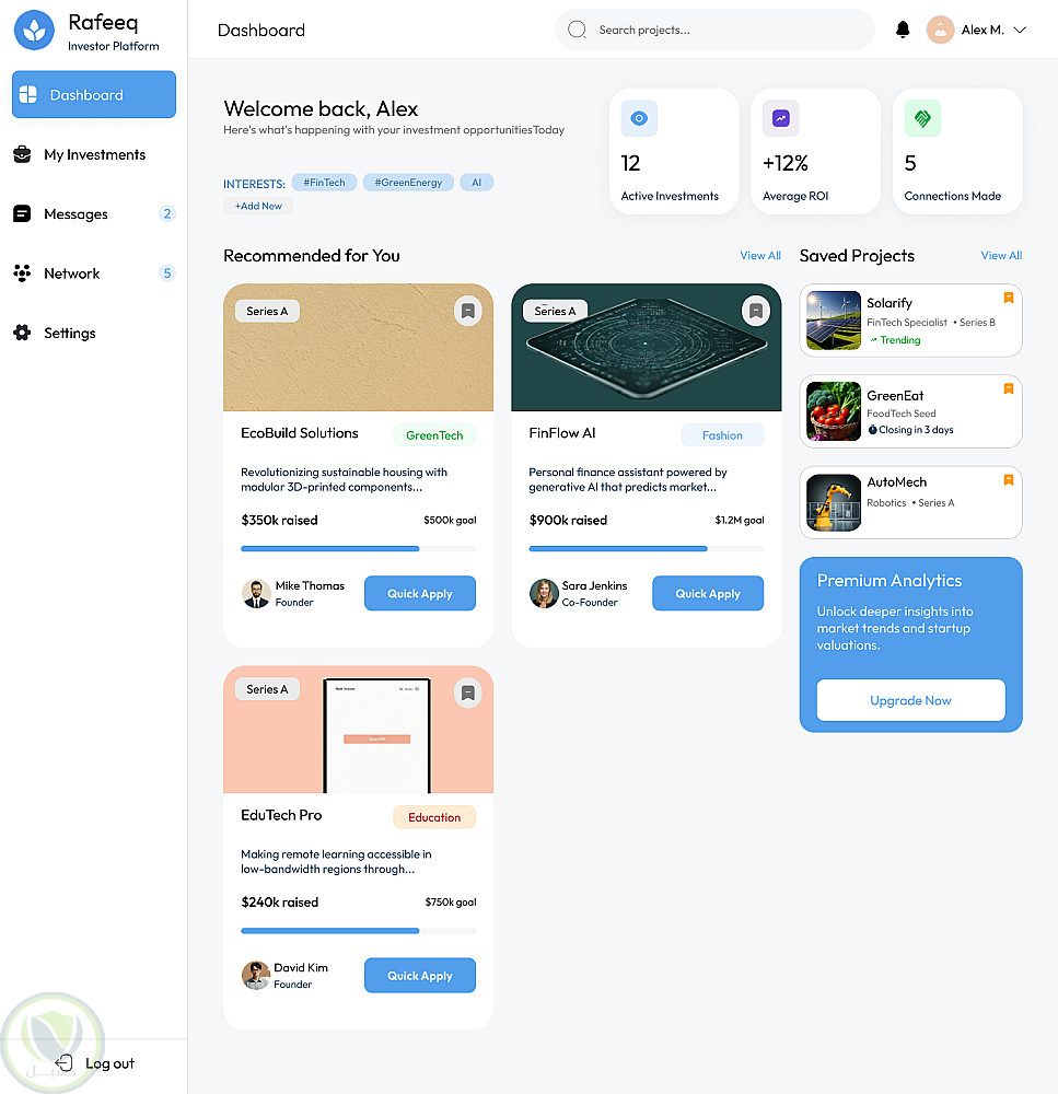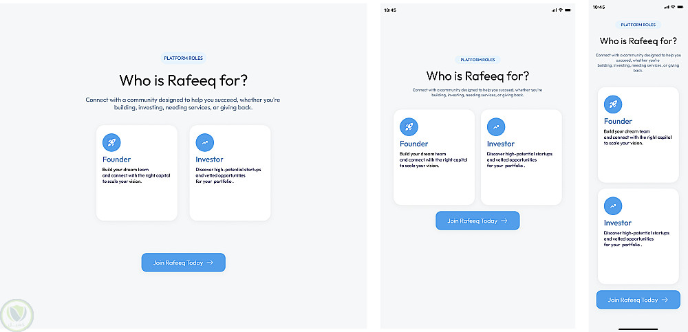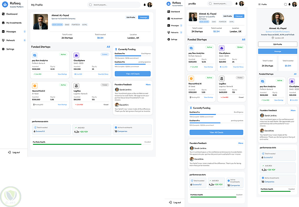 قمت بتصميم واجهة ويب متكاملة لمنصة "Rafeeq" التي تهدف إلى ربط رواد الأعمال (Founder) بالمستثمرين (Investor).