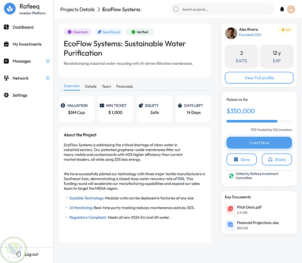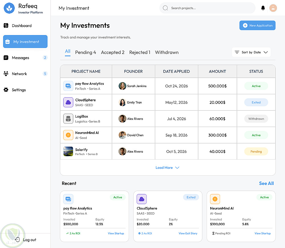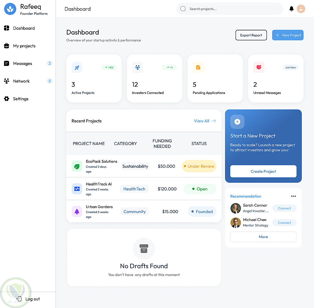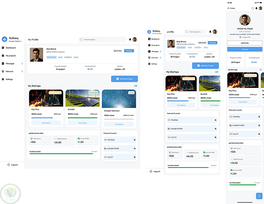 قمت بتصميم واجهة ويب متكاملة لمنصة "Rafeeq" التي تهدف إلى ربط رواد الأعمال (Founder) بالمستثمرين (Investor).
