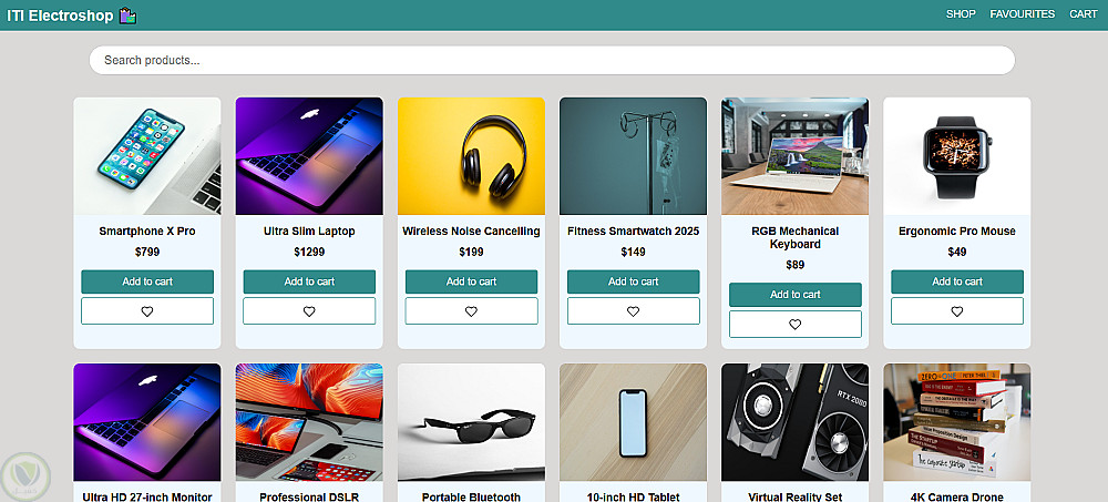 قمت بتطوير متجر إلكتروني متكامل متعدد الصفحات (Shop – Cart – Favorites) يعتمد على جلب البيانات من API خارجي وعرضها ديناميكيًا داخل الصفحة، مع إدارة كاملة لحالة المستخدم باستخدام Local Storage.