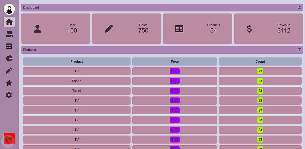 كما يحتوي على قسم لعرض إحصائيات سريعة مثل عدد المستخدمين، عدد المنشورات، المنتجات، والإيرادات، بالإضافة إلى جدول يعرض بيانات المنتجات بشكل منظم.