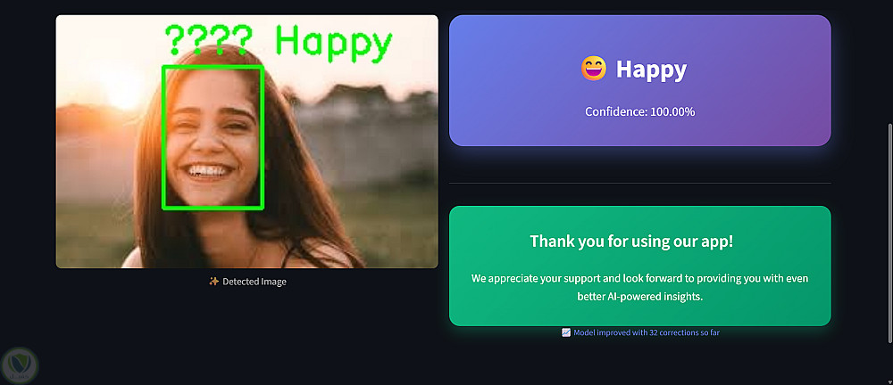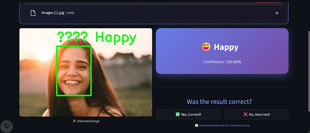 يقوم النظام باكتشاف الوجه داخل الصورة، ثم معالجته مسبقًا (تحويله إلى تدرج رمادي، تغيير الحجم، التطبيع)، وبعد ذلك يتم إدخاله إلى النموذج المدرّب للحصول على توقع المشاعر مع نسبة الثقة لكل نتيجة.